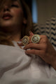These earrings are perfect for adding a touch of regal elegance to any occasion. Silver alloy, gold plated, stone polkis earrings with faux pearls. Comes with push closure.