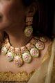 Indulge in the vibrant beauty of Meenakari jewelry, where ancient artistry meets contemporary elegance in every meticulously crafted piece. Our Meenakari collection celebrates the centuries-old art of enameling, known for its intricate designs and vibrant colors. Silver alloy, gold plated, stone polkis with faux pearls.Comes with traditional dori closure