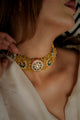 Perfect for day-to-night transitions, our choker effortlessly complement both casual attire and evening wear. Silver alloy, gold plated, stone polkis with faux pearls.Comes with traditional dori closure.
