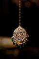 Elevate your style with this embodiment of heritage and grace with our jaya maangtika. Made in Silver alloy, gold plated studded with stone polkis, faux pears and green stone drops.