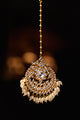 From house of Vilasa Jaipur we present to an intricate jadau style design maangtika made in Silver alloy, gold plated, stone polkis, coloured stones,  faux pearls, green beads, finished with pastel green Aventurine stone drops.